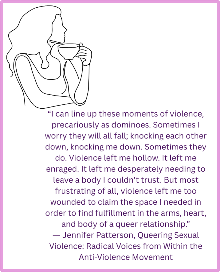 Patterson, Jennifer (2016). “Queering Sexual Violence: Radical Voices from Within the Anti-Violence Movement.”