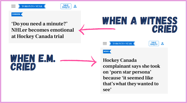 Below you will see a poignant example that Anova has provided of news headlines perpetuating the idea that those accused of sexual violence require all the compassion we can muster, while those who report sexual violence are hyper-sexualized.