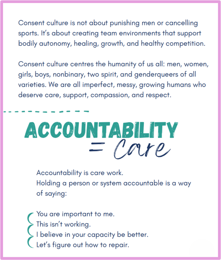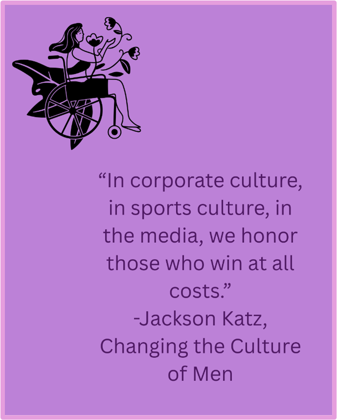 The culture surrounding most sports, especially hockey, is one of hegemonic masculinity because it is traditionally a very male-centered space. “Hegemonic” masculinity means the kind of masculinity that is most dominant or normal in our culture. In sports culture today, hegemonic masculinity can look like hyper-competitiveness, excessive risk-taking, stigmatization of accessing care, belittling the emotions of others or oneself, the objectification and hyper-sexualization of women and girls, homophobia and transphobia and seeing violence as a viable solution to problems. Consider the definitions of “accountability” that Anova provides to us and this quote from masculinity scholar Jackson Katz on cultures of domination: