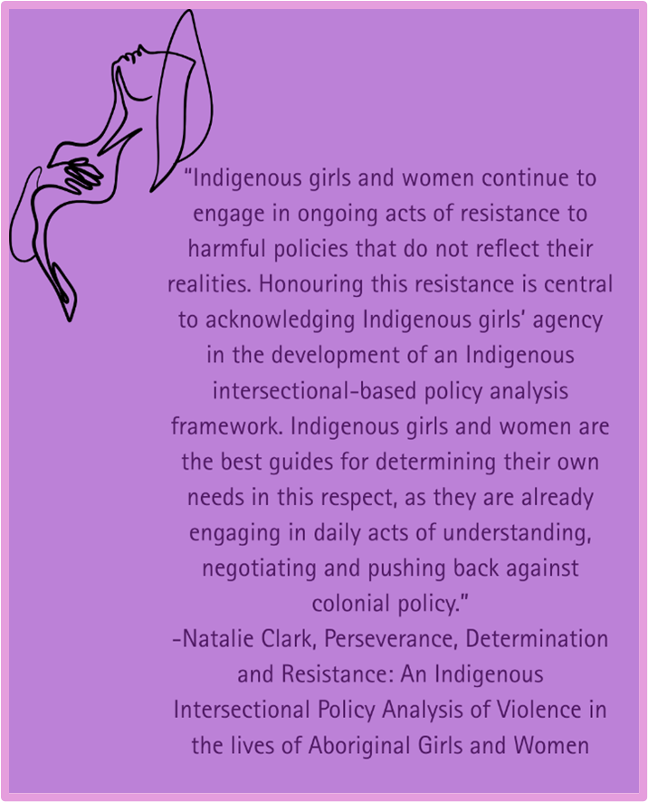 Clark, Natalie (2013). “Perseverance, Determination and Resistance: An Indigenous Intersectional Policy Analysis of Violence in the Lives of Aboriginal Girls and Women.”